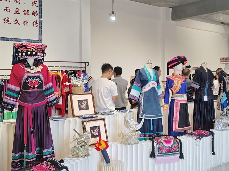 如今,这条街已聚集“布依垚”、“彝外婆”等20余家民族特色企业,涉及刺绣、蜡染、银饰、服装等。一件件气韵生动、精美绝伦的民族手工服饰和文创产品,深受游客的喜爱、赞不绝口,纷纷穿戴体验、打卡拍照。
